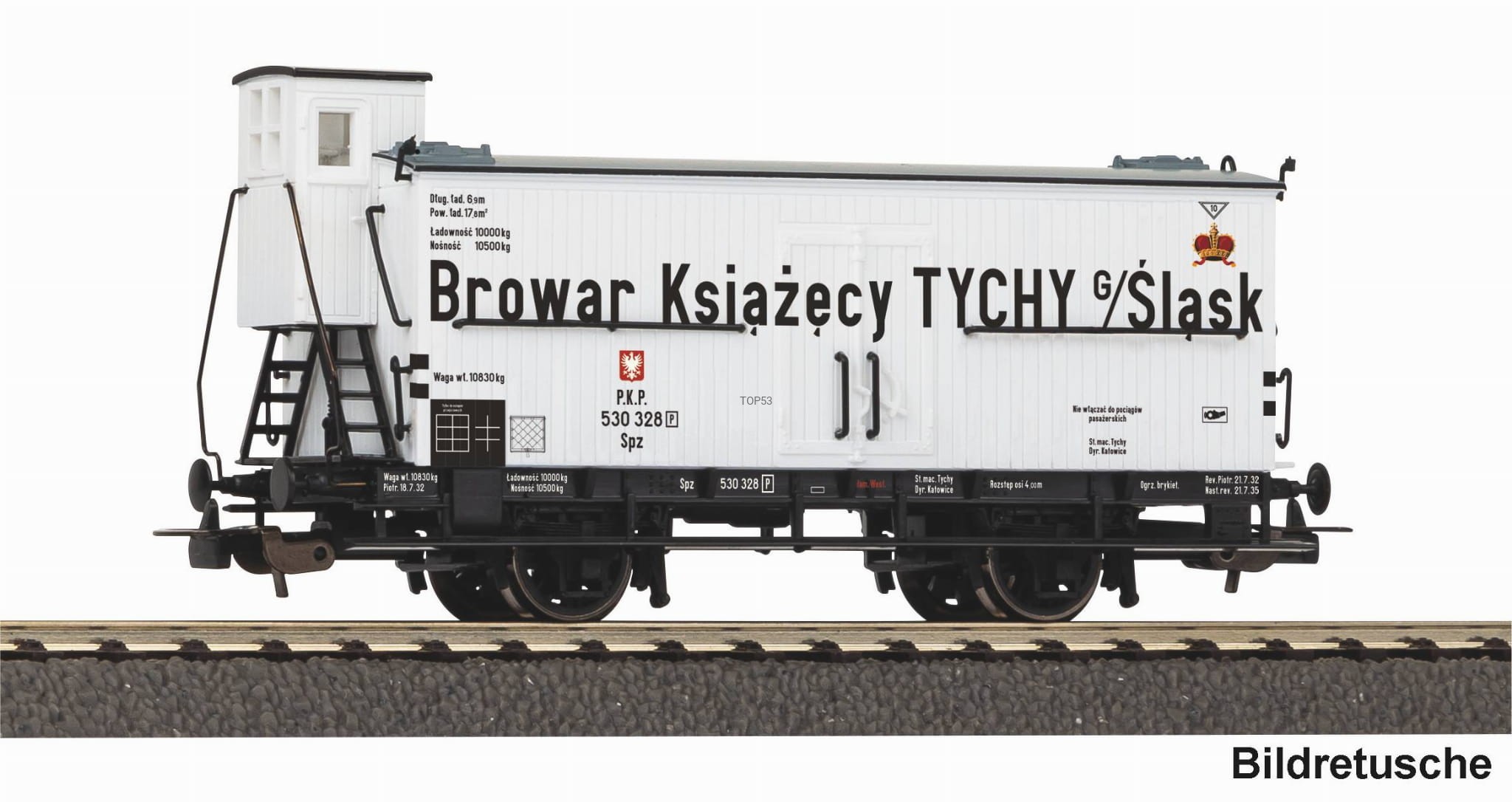 Model PIKO 24557 przedstawia 2‑osiowy wagon towarowy do przewozu piwa z historycznym oznaczeniem Polskich Kolei Państwowych ([P]) z Epoki II, typowy dla ruchu towarowego lat 20. i 30. XX wieku.